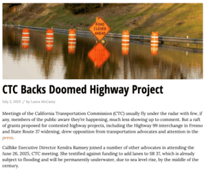In brainstorming with Transform, we came up with the concept that by widening a section of State Route 37 predicted to be underwater within a few decades due to sea level rise, Caltrans was effectively throwing money into the San Francisco Bay. We ran with this concept, using it as a slogan for Transform’s campaign to stop this climate-killing highway expansion. We made a cartoon to illustrate the concept, and it was widely picked up by the media. What would normally be a niche, hard-to-communicate campaign with little mainstream traction became a rallying cry to stop Caltrans from throwing taxpayer dollars into the bay.