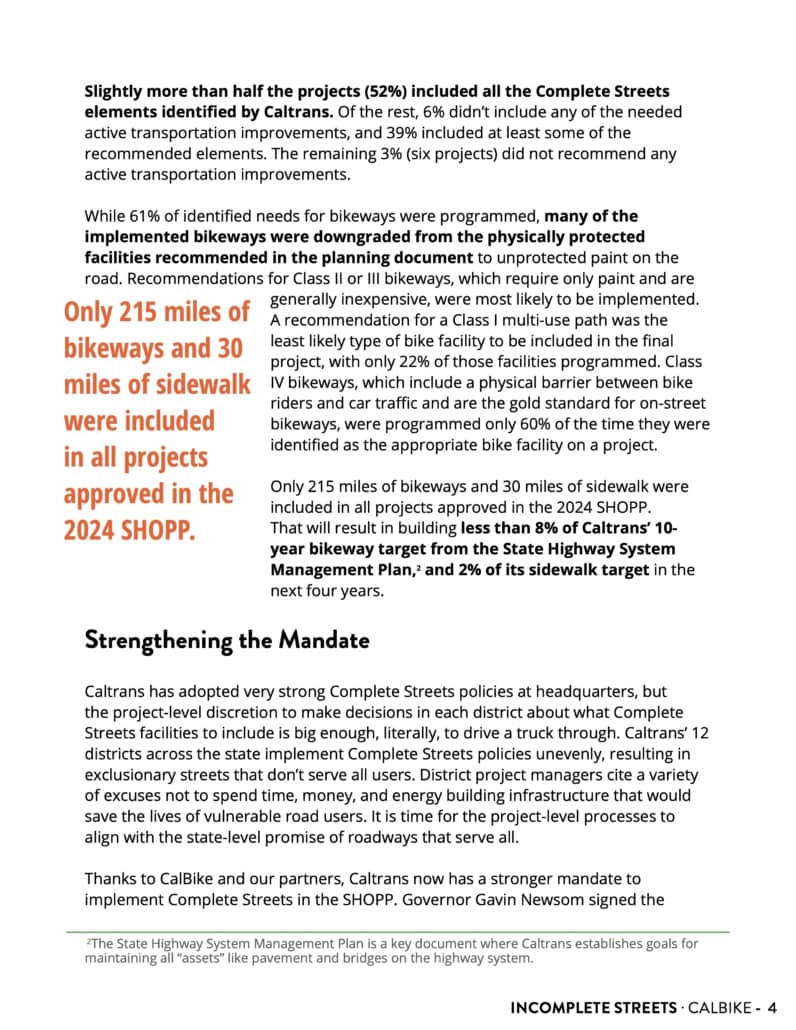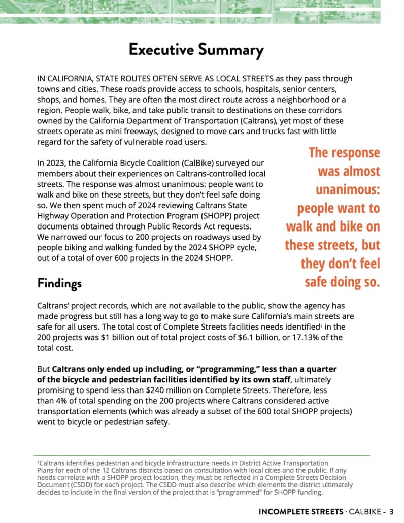 Several months later, CalBike got a huge dump of documents. We collaborated, with support from the team, to review and analyze the data to determine trends and find compelling narratives to illustrate Caltrans’ lack of care for people who get around by bike or on foot. We previewed the resulting report in the summer and fall of 2024 with three articles co-published on the CalBike blog and in Streetsblog California, highlighting aspects of the research. These articles were aimed at influencing both Caltrans, whose opposition can often kill a transportation bill, and Governor Gavin Newsom, who vetoed similar legislation the last time it was on his desk.